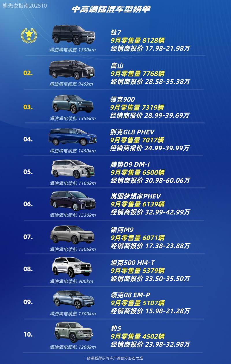 各品牌针对不同消费群体实施差异化策略:方程豹以硬派越野设计吸引户外爱好者,领克通过年轻化运动风格抢占都市精英市场,腾势与长城汽车则聚焦高端家用和商务场景。这种精准定位使中高端插混车型在2025年9月实现市场突破,当月销量榜单前五名分别为钛7、高山、领克900、别克GL8 PHEV和腾势D9 DM-i。